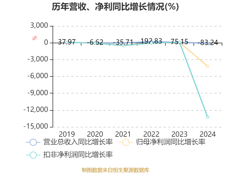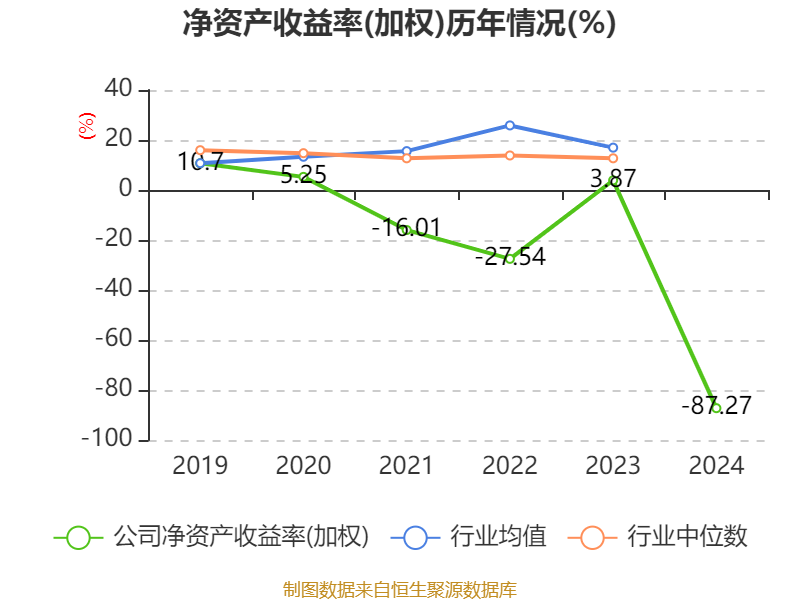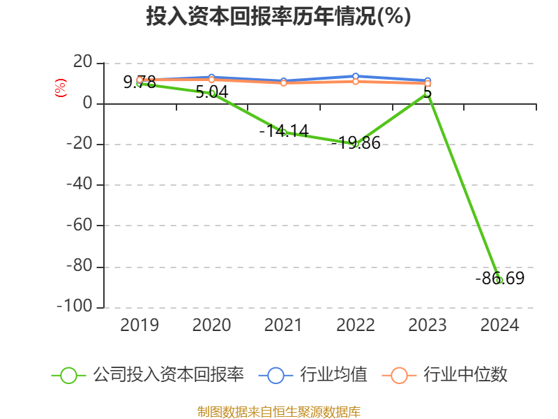 数据显示,2024年公司加权平均净资产收益率为-87.27%,较上年同期下降91.14个百分点。公司2024年投入资本回报率为-86.69%,较上年同期下降91.69个百分点。