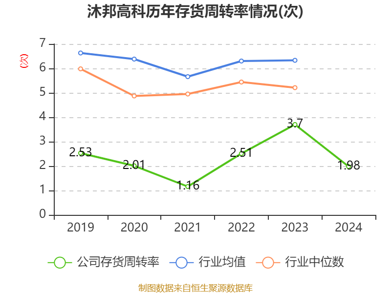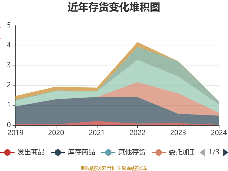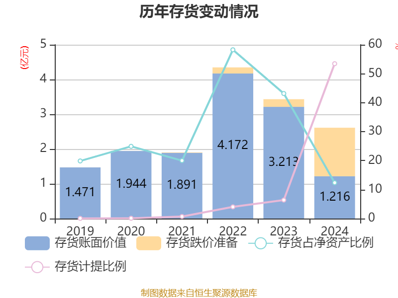 从存货变动来看,截至2024年末,公司存货账面价值为1.22亿元,占净资产的12.36%,较上年末减少2亿元。其中,存货跌价准备为1.4亿元,计提比例为53.44%。