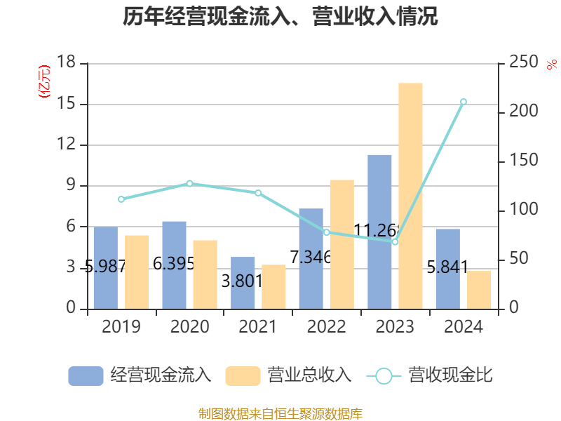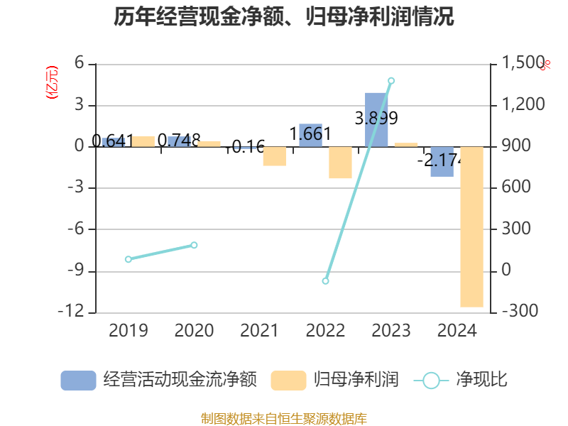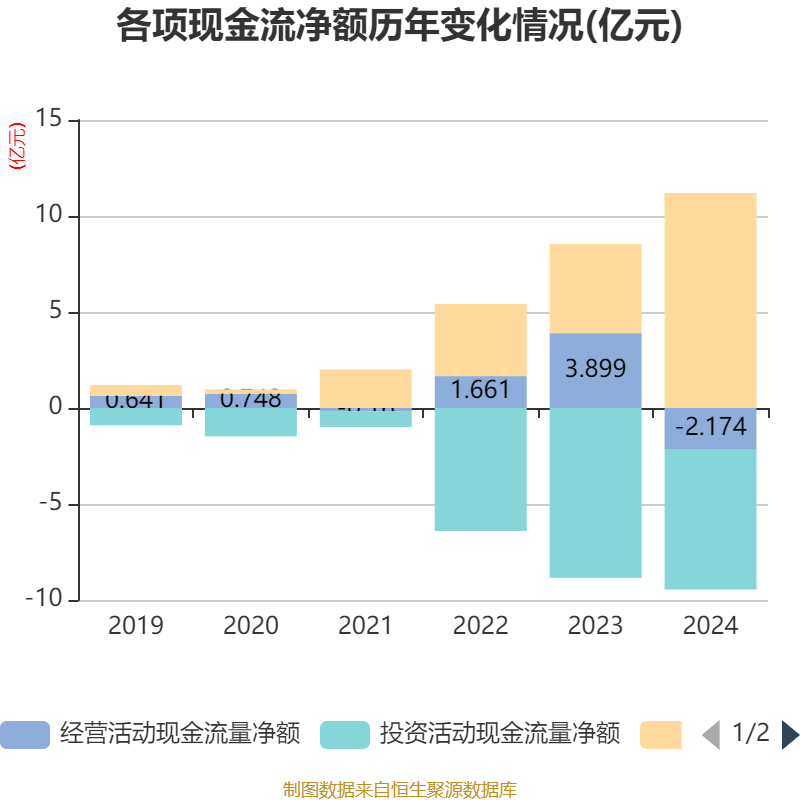 截至2024年,公司经营活动现金流净额为-2.17亿元,同比减少6.07亿元;筹资活动现金流净额11.2亿元,同比增加6.56亿元;投资活动现金流净额-7.28亿元,上年同期为-8.84亿元。
