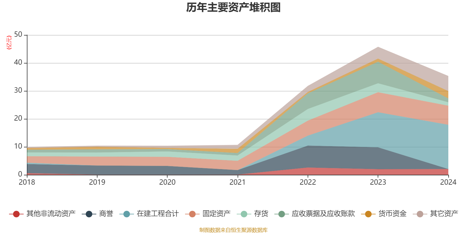 资产重大变化方面,截至2024年末,公司在建工程合计较上年末增加26.29%,占公司总资产比重上升17.43个百分点;商誉较上年末减少100%,占公司总资产比重下降17.11个百分点;应收票据及应收账款较上年末减少82.06%,占公司总资产比重下降12.93个百分点;货币资金较上年末增加137.25%,占公司总资产比重上升4.98个百分点。